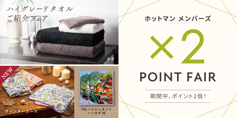 日頃のご愛顧に感謝し、上記期間中にお買い上げいただくと、ホットマンメンバーズのお買い物ポイントが2倍になる「ダブルポイントフェア」を開催いたします。(一部除外あり)