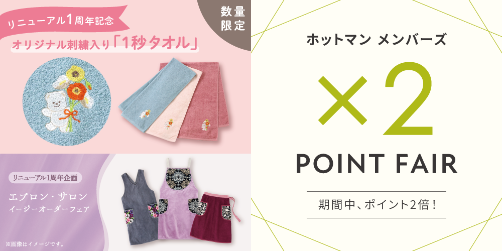 上記期間中、お買いあげごとにホットマンメンバーズポイントを通常の2倍差しあげます。(一部除外あり)