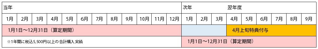 ボーナスポイントは毎年1月1日から12月31日までの1年間に税込5,500円以上お求めいただいた会員が対象で、翌年度4月上旬に500ポイントを付与する会員特典です。