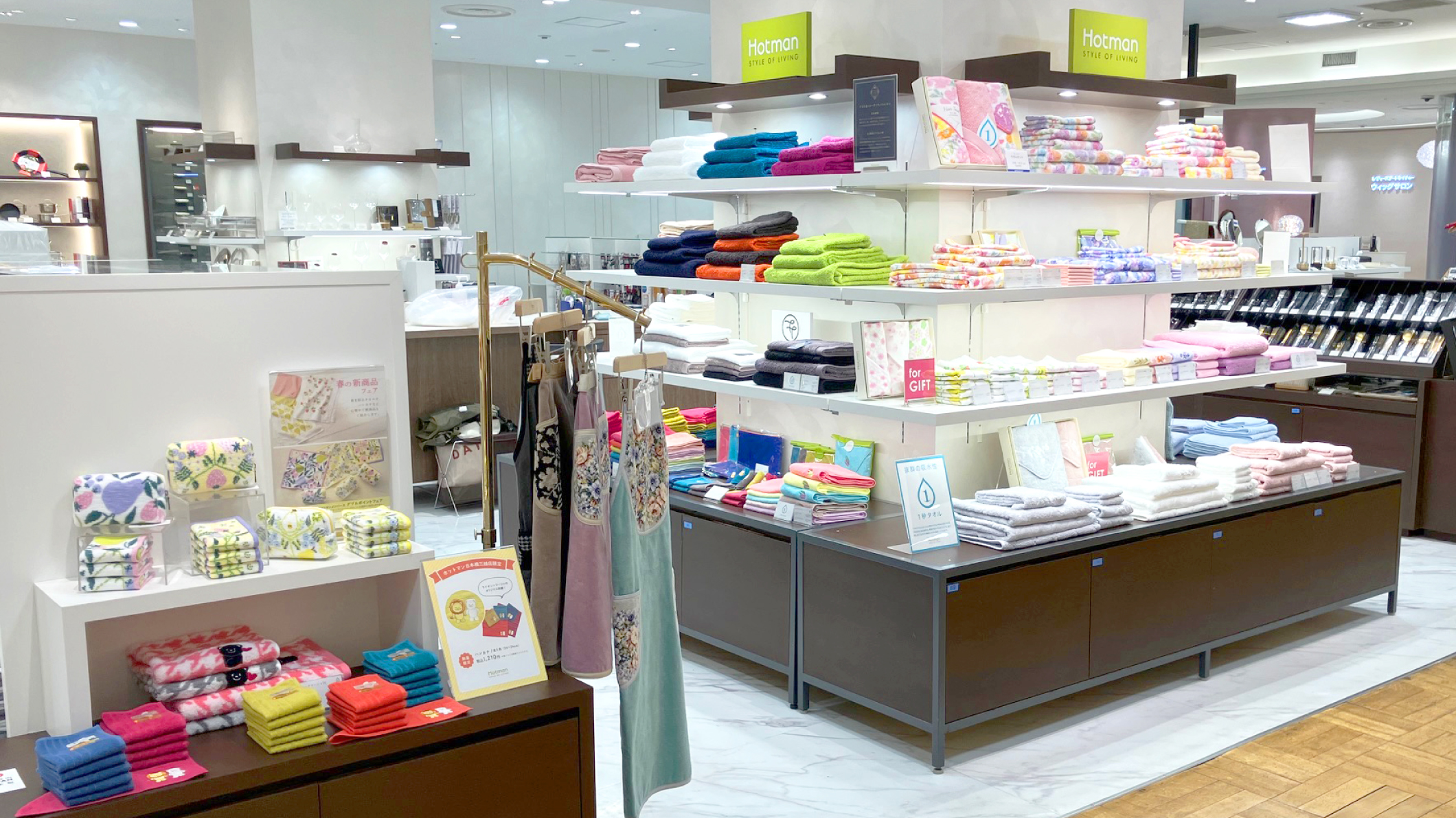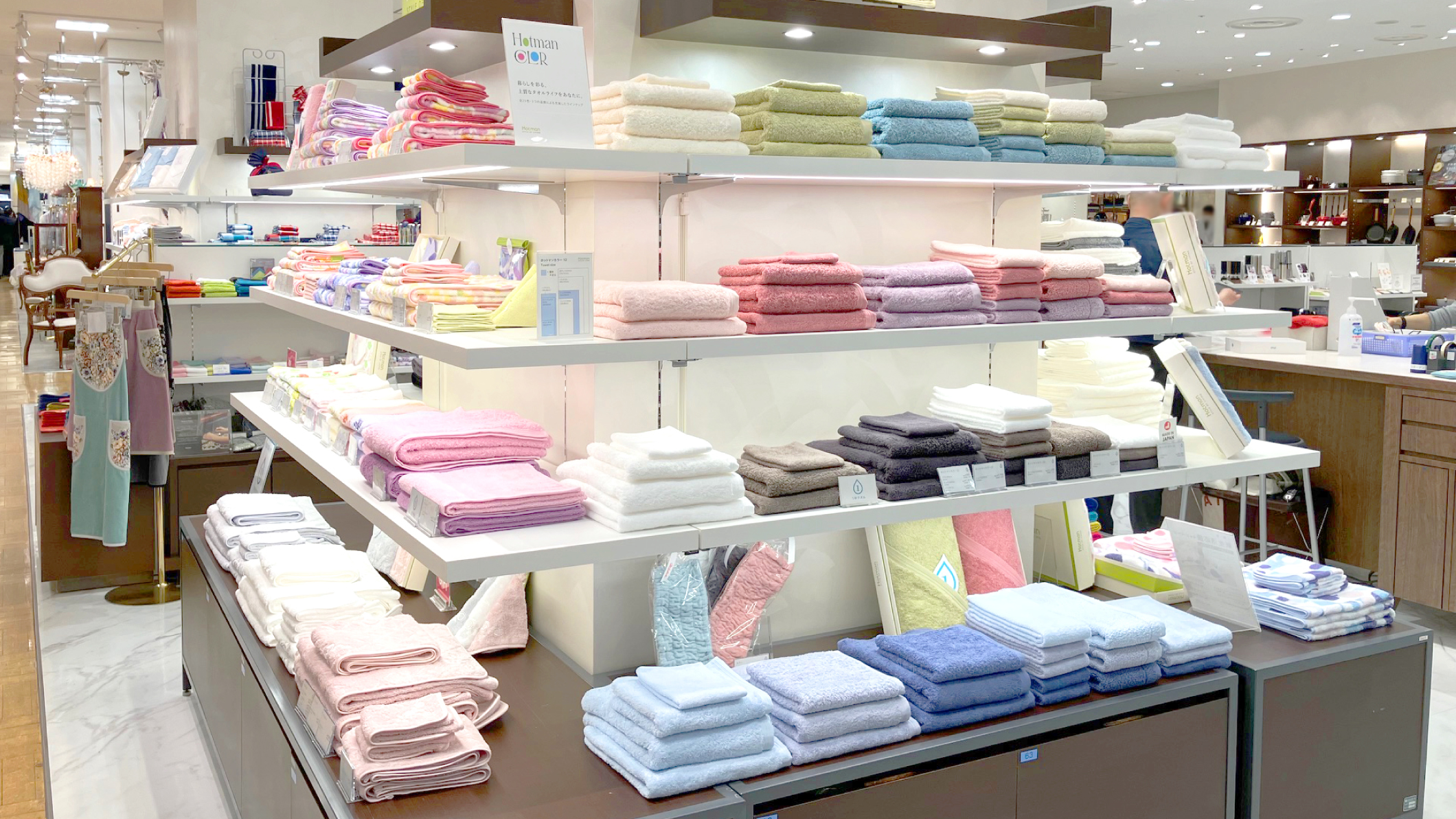 ホットマン日本橋三越店は、大人気の1秒タオル「ホットマンカラー」シリーズをはじめ、上質なアイテムを豊富に取り揃えております。